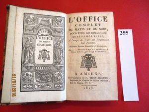 AMIENS – OFFICE du MATIN et du SOIR et des FETES de l’ANNEE imprimé avec la permission de Monseigneur Demandol Evêque d’Amiens. Chez Caron-Berquier à Amiens en 1815. Volume in-8, relié pleine basane, 648 pages.