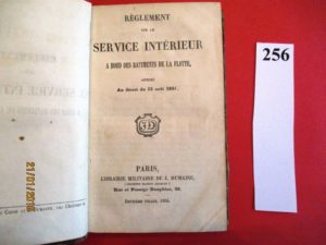 MARINE – REGLEMENT A BORD des NAVIRES de LA FLOTTE. Paris 1854, petit in-12 relié, 410 pages. Ex-libris Danzel d’Aumont.