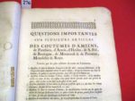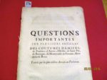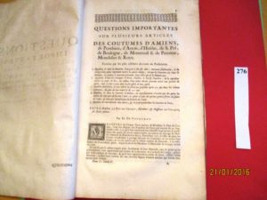 PONTHIEU, ARTOIS, HESDIN, SAINT-POL, BOULOGNE sur MER, MONTREUIL, PERONNE,MONTDIDIER et ROYE. QUESTIONS IMPORTANTES sur plusieurs articles des COUTUMES d’AMIENS. Extrait du COUTUMIER de PICARDIE, de 1726, in-folio de 204, pages, broché.