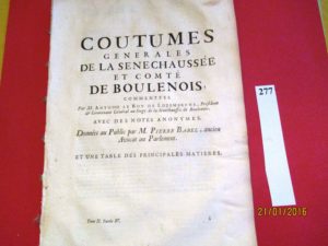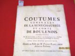 BOULONNAIS - COUTUMES GENERALES de la SENECHAUSSEE et Comté de Boulonois commentées par Antoine LE ROY de LOZEMBRUNE, Lieutenant Général de la Sénéchaussée de Boulenois. Extrait du COUTUMIER de PICARDIE, de 1726, in-folio de 214, pages, broché.
