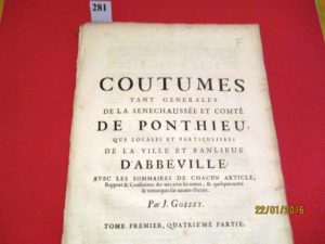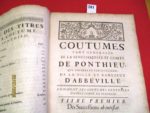 PONTHIEU et la VILLE d’ABBEVILLE, Coutumes de la SENECHAUSSEE et comté, suivies de commentaires sur la COUTUME d’AMIENS. Par J. GOSSET. Extrait du COUTUMIER de PICARDIE, de 1726, in-folio de 234, pages, broché.