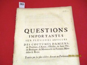 AMIENS, PONTHIEU, ARTOIS, HESDIN, SAINT-POL, BOULOGNE sur MER, MONTREUIL, PERONNE,MONTDIDIER et ROYE. QUESTIONS IMPORTANTES sur plusieurs articles des COUTUMES. Extrait du COUTUMIER de PICARDIE, de 1726, in-folio de 204, pages, broché.