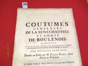 BOULONNAIS - COUTUMES GENERALES de la SENECHAUSSEE et Comté de BOULONOIS commentées par Antoine LE ROY de LOZEMBRUNE, Lieutenant Général de la Sénéchaussée de Boulenois. Extrait du COUTUMIER de PICARDIE, de 1726, in-folio de 214, pages, broché.