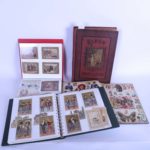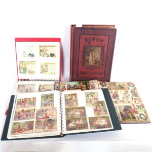 4 albums d'images d'Épinal, chromo et autres Cartes publicitaires de chocolat, café, fournisseurs, grands magasins, chausseurs etc Reprenant des œuvres, inventions, personnages historiques, chansons populaires, traditions etc Quelques cartes...