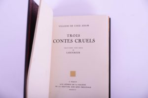 Auguste, Comte de VILLIERS DE L'ISLE-ADAM et Jean-Émile LABOUREUR Trois contes cruels. Paris, aux dépens de la Société de la gravure sur bois originale, 1927 ; in-8 en ff Tirage à 160 exemplaires, celui-ci non numéroté Étiquette en première...