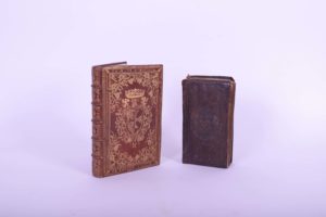 Ensemble de 2 reliures du XVIIIe en maroquin et veau Une reliure dorée au feu extrèmement riche sur les deux plats; dos à 5 nerfs aux caissons dorés pour le plein veau Une reliure en maroquin, les plats ornés en leur centre d'armoiries royales...