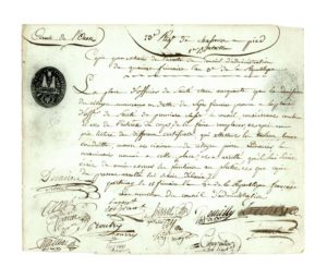 [ARMÉE de l'OUEST] — Copie par extrait de l'arrêté du Conseil d'administration. — Partenay, 1794, in-4 oblong, 1 pp. sur double feuillets, en-tête manuscrit, cachet humide en négatif du 23e Régiment de Chasseurs.