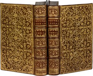 NOUVEAU TESTAMENT DE NOSTRE SEIGNEUR JÉSUS CHRIST (LE), Traduit en Français selon l'édition Vulgate, avec les différences du Grec. Mons, GaspardMigeot, 1667 ; 2 vol. pet. in-8, reliures de l'époque maroquin olive, les plats et les dos...