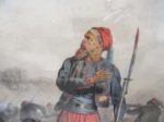 Plus avant (pp.92) il décrit : "Les deux planches intitulées les Zouaves pendant et après l'action portent au contraire le même titre court et concis : Qu'est-ce qui en demande encore ? Parlez, faites-vous servir, et les sujets sont dissemblables, bien que les personnages mis en scène soient identiques de type mais non de mouvement". Suit la description (evidemment inversée par rapport à notre dessin) de la première (selon Adeline) planche : "un superbe zouave debout désigne à la fois de la main gauche, et son fusil et les cadavres de soldats russes qui gisent près de lui (...) du coté opposé, des zouaves vus de dos enlèvent une tranchée à la baïonnette et bousculent les russes. La figure principale est remarquablement traitée et le visage énergiquement accentué dispenserait la planche de sa signature"...