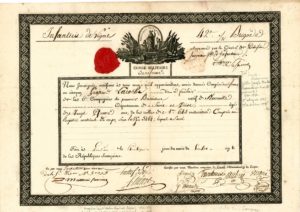 Congé militaire de réforme délivré à un fusilier du 1er bataillon de la 42e demi-Brigade de Ligne , à cause de son "bras gauche réellement atrophié" suivant le certificat médical au verso.