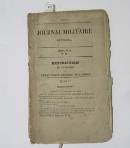 JOURNAL MILITAIRE OFFICIEL. — DESCRIPTION de l’uniforme de l’état-major_x000D_ général de l’armée. — Paris, Cosse et J. Dumaine, 1844, in-8, paginé 219-232,_x000D_ 10 pl. dépl., broché sous ficelle. — Rousseurs.