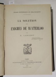 LENIENT (E.). — La Solution des énigmes de Waterloo. — Paris, Plon, 1915, gr. in-8, biblio., percaline verte (rel. moderne). — Ex-libris Jean-JacquesPattyn.