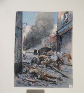 LEROUX (Pierre-Albert). — [Scène de combat dans une ville]. — S.l., 1945, 29,5_x000D_ x 38 cm.. — Gouache sur papier._x000D_ — Gouache originale signée et datée 1945._x000D_ — La scène est celle d’un combat de rue dans une ville à la...