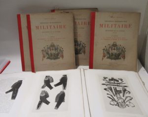 THOUMAS. — Exposition rétrospective militaire du Ministère de la guerre en 1889. — Paris, Launette, 1890, 8 vol. in-folio, avec 18 planches hors-texte (sur 19), et de très nombreuses reproductions en photogravure (armes, armures, uniformes,...