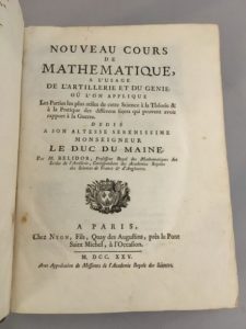 [MILITARIA/BÉLIDOR (Bernard Forest de)]. Nouveau Cours de mathematique, a l'usage de l'artillerie et du genie où l'on applique les Parties les plus utiles de cette Science à la Théorie & à la Pratique des differens sujets qui peuvent avoir rapport à la Guerre. A Paris, Chez Nyon, Fils, 1725. In-4°, veau, dos à nerfs orné (reliure de l'époque).