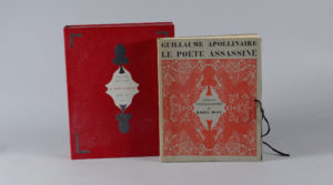 APOLLINAIRE (Guillaume). Le Poète assassiné. Paris, Se trouve Au Sans Pareil, 1926. In-4° broché, couverture et chemise à lacets ornées, boîte-étui de chagrin rouge ornée d'un décor mosaïqué en galuchat repris des motifs de la couverture et de la chemise, titre sur le premier plat (Antonio p. n.).