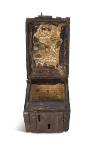 PETIT COFFRET À LIVRE D'HEURE — En cuir et âme de bois, pentures de fers, couvercle à charnière et serrure à moraillon. — Il dévoile sous l'abattant une rare estampe, produite d'un bois gravé au sujet d'un Ecce Homo : épreuve coloriée en...