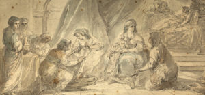 Jacques GAMELIN (Carcassonne, 1738 - 1803) — La Visitation ; Naissance de la Vierge— Plume et encre noire sur papier, lavis de gris, de brun et de bleu 18,9 x 41,4 cm (chaque).