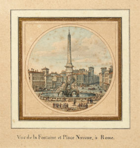 Victor-Jean NICOLLE (Paris, 1754 - 1826) — Vue de la place Navone à Rome Plume et encre brune, aquarelle dans un cercle Localisée sur le montage dans le bas. — Vue de la Fontaine et Place Navone, à Rome 8,5 x 8,5 cm.