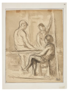 Maximilien LUCE (1858 - 1941) — Travailleurs autour d'une table — Encre et fusain sur papier — Signée en bas à gauche et marquée du cachet ‘Luce' [Lugt non décrit] en bas à droite Ink and black chalk on paper, signed lower left and...