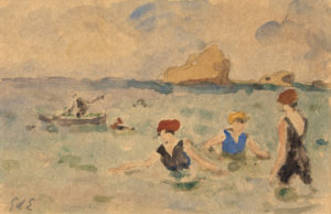 Georges d'ESPAGNAT (1870 - 1950) — Baigneuses et homme dans un canot — Aquarelle et crayon sur papier — Signée du monogramme en bas à gauche — Watercolor and pencil on paper, signed with the artist's monogram lower left 11,5 x 17,8 cm - 4...