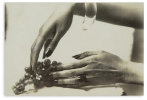 JACQUES HENRI LARTIGUE (1894 - 1986) — « La main aux raisins », photographie originale [Circa 1930], tirage argentique, 6 x 8 cm, sous encadrement. — Tirage argentique d'époque, représentant les mains de Renée Perle, accompagné au dos de...