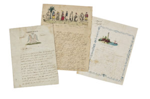 - Pierre Lantellier, du 10e Rég. de Ligne, portrait en pied gravé et aquarellé, à pleine page ; Metz 6 juin 1811, Pierre Ots, soldat au train d'artillerie, vignette colorée d'artillerie à cheval. Lille 24 mars 1813, lettre d'Antonia Rigaud à sa mère, pour sa fête, avec panier de fleurs aquarellé. 2 lettres à bordure gaufrée et dorée (1814). Lettre à bordure gaufrée avec son enveloppe (1809). Lettre à un oncle pour sa fête (Rouen 1811) avec aquarelle d'une femme tenant un bouquet. XIXe siècle. 2 lettres à bordure colorée au pochoir, avec adresse (1807 et 1819). 2 images gravées et coloriées pour lettres de cantinière, en pleine page : cuirassier à cheval et grenadier. 3 lettres à bordure ornée avec vignette coloriée, adresses (1838 - 1840) : jeune fille en prière, amour, ange. L.a.s. en allemand de Heinrich Dauer au peintre Sauer, Birkadem près Alger 7 janvier 1850 ; vignette gravée et coloriée, légendée, avec 9 personnages : Kabile, Nègre, Négresse, Juive, Juif, Bédouin, Bédouine, Mauresque, Maure. Lettre avec 2 dessins aquarellés (Orléans, 1835).