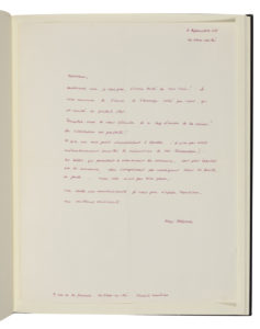 Il le remercie de lui offrir la reliure d'Ubu ; «la question d'un nouvel exemplaire de la reliure-objet (anneaux de cardan) des Jeux de la Poupée n'est pas simple du tout. Il s'agissait de trois exemplaires numérotés et signés, “édités” en accord avec M. Rasmussen. Pour ne pas déprécier ces trois exemplaires il me parait exclu d'en ajouter un autre»...