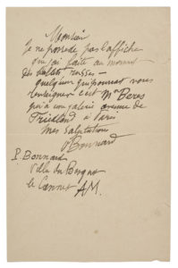 BONNARD Pierre (1867 - 1947) — L.A.S. «PBonnard», Villa du Bosquet, Le Cannet ; 1 page in-8.