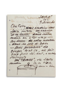 CALDER Alexander (1898 - 1976) — L.A.S. «Alexander Calder» avec DESSIN, Saché 9 juillet 1960, à son plombier M. Ferry à Azay-le-Rideau ; 1 page et demie in-4 (trous de classeur), enveloppe.