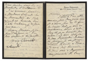 «J'étais à Paris cette semaine pour deux jours, mais je n'aurais pas eu la force de causer art, je suis en convalescence mais c'est long et je ne travaille pas encore. Je suis obligée de vous demander de venir ici puisque je ne puis retourner de suite à Paris». Sa nièce, qui va repartir pour l'Amérique, doit venir la voir... «Mon auto est en réparation mais j'ai une petite voiture en location, je serai obligée de vous demander de venir jusqu'à Chaumont en Vexin. Je serais heureuse de vous dire de vive voix combien j'admire votre beau livre sur le SODOMA[Giov. Antonio Bazzi detto Sodoma et la fin de l'école de Sienne au XVIe siècle]. Je l'ai lue avec un grand plaisir. Quand au livre que vous me dédiez, il me semble que mon bagage artistique est bien léger. Il y a bien longtemps que je n'ai vue de mes tableaux, on me dit qu'il y a deux très anciennes choses au salon d'Automne de moi. Comment trouvez-vous ce procédée, d'exposer des tableaux d'un peintre sans lui en demander l'autorisation ?»...