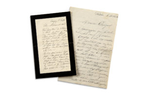 «Ayant appris que la toile de 40 que Monsieur TANGUY a dû vous remettre ne possédait pas son cadre, je vous serai très-obligé, si vous le voulez bien, de faire porter chez vous la bordure du susdit tableau»... Il s'excuse de ce nouveau dérangement. Il ajoute : «nous sommes tous en bon état, et depuis notre arrivée, nous jouissons de toutes les variabilités athmos­phériques que le ciel veut bien nous départir. Monsieur PISSARRO, que nous avons vu hier, nous a donné de vos nouvelles»... Sa femme et «Paul Junior» lui présentent «leurs plus affectueuses caresses»... Correspondance (éd. John Rewald), p. 199. On joint une l.a.s. d'Hortense CÉZANNE à Mme Chocquet, Émagny 1er août (4 p. in-8, deuil, petites fentes). Elle va repartir en Suisse avec Cézanne, où ils vont tenter de trouver une maison. «Nous avons vu Vevey où Courbet a fait ce joli tableau que vous possédez [...] Mon mari a pas mal travaillé malheureusement, il a été dérangé par le mauvais temps [...] Il n'en continue pas moins de se rendre au paysage, avec une ténacité digne d'un meilleur sort»...