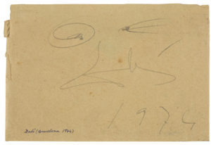 DALI Salvador (1904 - 1989)— Signature avec croquis et date au crayon, 1974 ; 1 page in-12 sur une enveloppe. — Signature «Dalí» et date «1974», avec deux petits croquis (yeux ?).