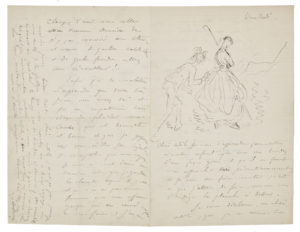 Amusante lettre ornée d'un grand dessin en tête. Gustave Doré s'est représenté de dos, échevelé, s'inclinant et avançant humblement vers une femme qui lui tourne le dos, bras croisés, tenant un grand bâton de randonnée, devant un paysage de montagnes.