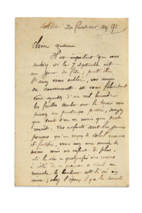 «Chère Madame, Il est important que vous sachiez si le 7 septembre est un jour de fête ; peut-être l'avez-vous oublié, vos amis se souviennent et vous félicitent. Vous regardez d'un oeil humide les feuilles tomber sur la terre vous pensez au printemps passé, songez que tout s'en va mais que tout renaît. Vos enfants sont les jeunes pousses qu'un rayon de soleil ranime et fortifie, vous avez une année de moins mais un enfant de plus. Si la vie a quelquefois ses revers à côté de ce grognon de Paul en revanche le bonheur est là où on aime ; chez l'époux il y a la sévérité, interrogez son coeur il vous répondra (I elske) [ j'aime, en danois]. Je le connais votre chenapan de mari, il n'ose vous dire aujourd'hui que le 17 sept. lui rappelle une heureuse naissance ; c'est un sceptique d'apparence mais n'en croyez rien je vous réponds de lui. Il me charge de vous l'écrire en peu de mots, la meilleure éloquence c'est la vérité et j'espère chère madame que vous avez confiance dans ma sincérité»...