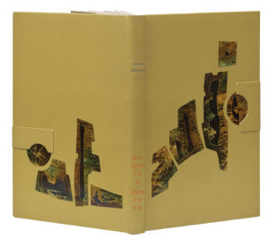 vert olive avec incrustations de motifs colorés et vernis, éléments appliqués à l'imitation de fermoirs, doublures et gardes de daim gris-vert, dos lisse avec titre, tranches dorées, couverture illustrée et dos conservés, chemise, étui bordé (Honnelaitre).