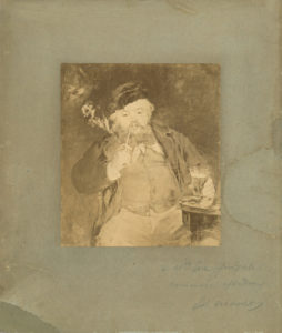 Dédicace du fameux tableau Le Bon Bock à son élève Éva Gonzalès. «à Mlle Eva Gonzalès hommage affectueux Ed. Manet». [