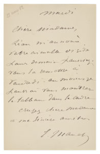 MANET ÉDOUARD (1832 - 1883) — L.A.S. «E. Manet», Mardi [22 mars 1892], à Mme Henri GUÉRARD [Éva GONZALÈS] ; 1 page in-8, enveloppe.