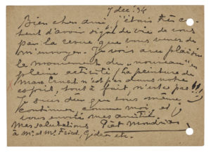 MONDRIAN PIET (1872 - 1944)— L.A.S. «Pier Mondrian», Paris 7 décembre 1934, à Alfred ROTH, architecte à Zürich ; 1 page oblong in-8, adresse au dos (carte postale ; trous de classeur).