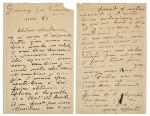 «Vous savez combien j'aimais votre cher mari et combien je serai fier d'avoir pu contribuer à lui faire obtenir la place à laquelle il a tant de droits. Il ne faut pas vous illusionner, car ce qui nous parait si naturel parait à d'autres bien audacieux et ce qui est triste à dire il y a encore des ennemis qui refusent de se rendre. Mais pour ma part je puis vous assurer que je ne me rebuterai pas et que je ferai tout pour arriver au but que nous voulons. Mr Portier que vous avez vu m'écrit pour me demander ce que vous devez faire de l'Olympia. Je crois que le mieux, si l'on vous apporte d'autres tableaux, de prendre également l'Olympia chez vous» ou chez Mme Eugène Manet [Berthe Morisot] ; mais il ne faut pas douter qu'il y aura bien des pourparlers avant d'obtenir satisfaction...