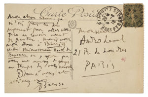 PICASSO Pablo (1881 - 1973) — CARTE postale autographe signée «Picasso», [Biarritz 9 août 1918], à André LEVEL ; carte postale illustrée en couleurs (Biarritz.— Le Casino Bellevue et la Rampe mobile), adresse et timbres.