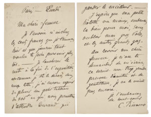 «Je toucherai le reste à la fin de l'exposition, [...] j'ai encore espoir de placer un petit tableau de 400 F ce qui nous permettra d'attendre Durand [DURAND-RUEL] qui parait-il fait très bien ses affaires à New-York. - Je sais que tout cela ne te consolera pas de la gêne que nous éprouvons, mais ma chère petite femme, tu prendras en considération les efforts que nous faisons, [...] je pense à toi et à nos enfants chaque fois que je considère l'avenir». Il attend Lucien : «jusqu'à présent son affaire de journal tient bon. - Quant aux dessins qui ont servi à faire les bois, que Dumas redemande, j'ai pris des renseignements on ne doit que le bois à l'éditeur à moins de conventions spéciales, mais l'éditeur étant le plus fort ayant le capital, peut vous envoyer promener, vous retirer le pain de la bouche»...