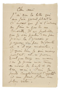 «je vais partir dans peu pour les Pyrénées y gagner un peu de santé et à Dax ensuite. Depuis hier je suis mieux portant. Est-ce pour quelque temps au moins car je passe mon temps à avoir des hauts et des bas, mais à Paris je perds complètement l'appétit. Il me faut filer au plus vite». Ne partant que dans une dizaine de jours, il espère que Monet passera le voir à Paris...