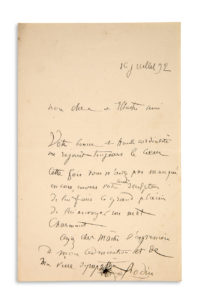 RODIN Auguste (1840 - 1917) — L.A.S. «Rodin» avec dessin d'une fleur, 10 juillet 1892, à un «cher et illustre ami» ; 1 page in-8.