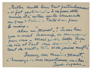 “Souvenir d'Amérique” et pour le père deux numéros “Etudes” [...] BUTLER semble tenir tout particulièrement - et fort gentiment - à exposer cette année et à entrer avec les camarades au Grand Palais. Faites donc pour le mieux. Alors un “Monet” ? Je sais bien que ce serait beaucoup de dérangement pour vous. Mais quelle belle leçon de vie et d'art vous donneriez à tant de vieilles bêtes et de jeunes mufles !»...