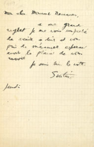SOUTINE Chaïm (1893 - 1943) — L.A.S. «Soutine», Jeudi [vers 1920 ?], à Eugène DESCAVES ; demi-page in-8.
