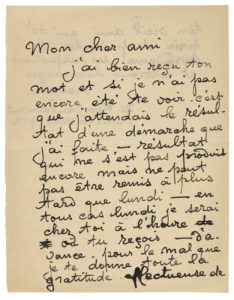Il s'excuse de ne pas être venu le voir plus tôt mais il attend le «résultat d'une démarche». Il passera lundi chez lui pendant l'heure des visites. «D'avance pour le mal que je te donne toute la gratitude affectueuse de ton vieil ami»...