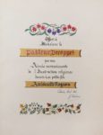 Beau document reprenant le 96ème psaume, (Cantate Domino), entièrement monté sur onglets et orné de larges encadrements à décor de guirlandes florales, peintes de plusieurs couleurs. Mention manuscrite au titre : « Offert à Monsieur le Pasteur Decoppet par une aïeule reconnaissante... donnée à sa petite fille Antoinette Rognon. A Colombes, Avril, 1884 ».
