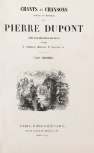 La notice de Charles Baudelaire paraissant ici pour la première fois est placée dans le premier tome. Pierre Dupont est né à Lyon en 1821 ; ses chansons et ses poésies sont, dans cet ensemble, illustrées de 160 gravures d'après les dessins de Johannot, Andrieux, Gavarni, Nanteuil, Staal,. Bel exemplaire. (Clouzot, 43).