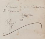 On joint : COMPLEMENT AUX FLEURS DU MAL. Bruxelles, chez tous les libraires, 1869. Plaquette in-12 de 30-[1]-1bl. pages, couv. imprimée. Contient les 6 pièces condamnées interdites en France. Mauvais état avec une page déchirée et réparée. Envoi manuscrit de 1883 « Souvenir de mon meilleur ami E (Ernest ?) Hebert, signé G. H. (illisible) (Clouzot 43-44).